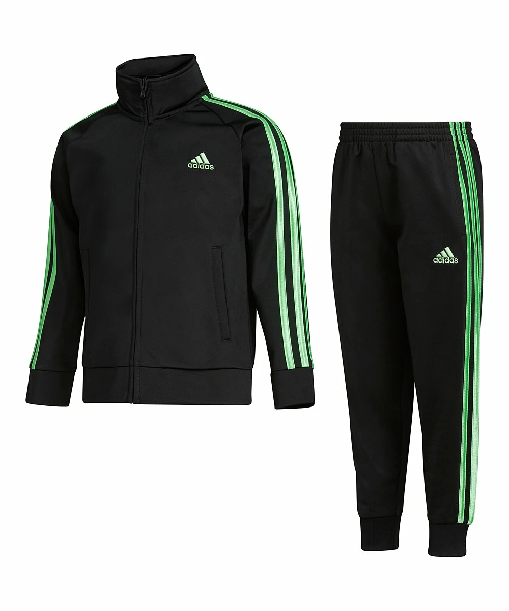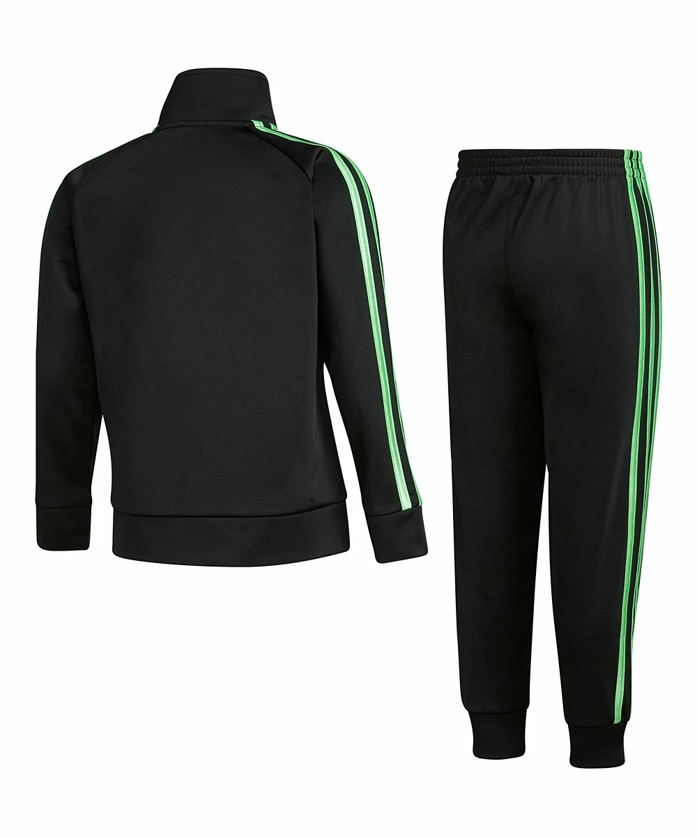 - Includes one black logo track jacket and one pair of bright green stripe track pants (two pieces total)
