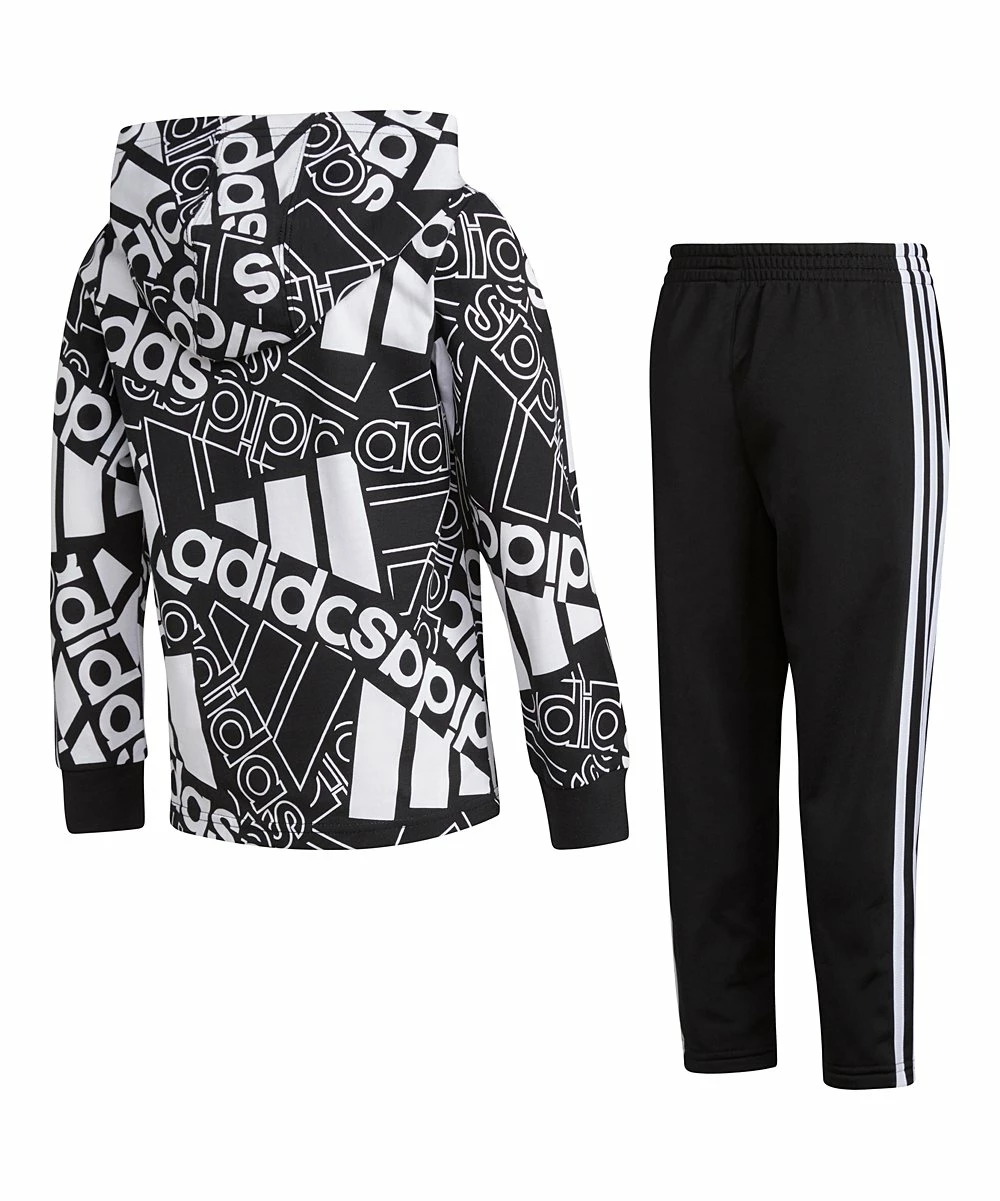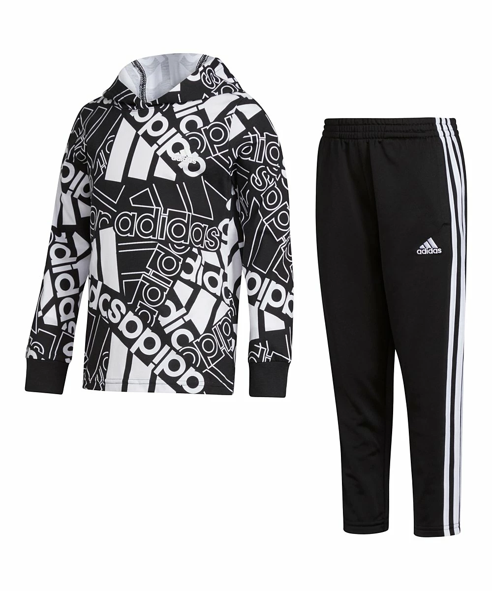 - Includes one bright white logo hoodie and one pair of black stripe joggers (two pieces total)