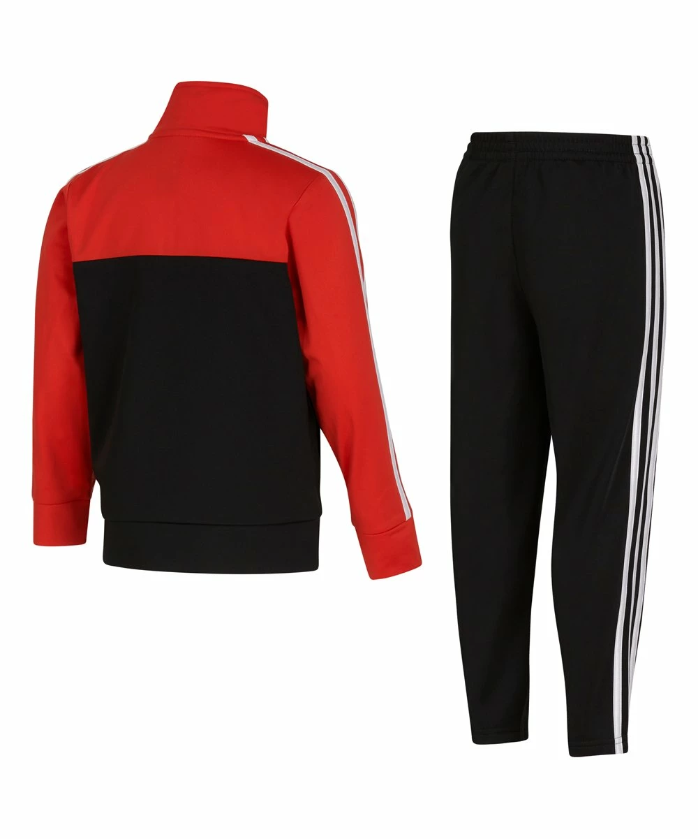 - Includes red and black color block jacket and black leggings (two pieces total)